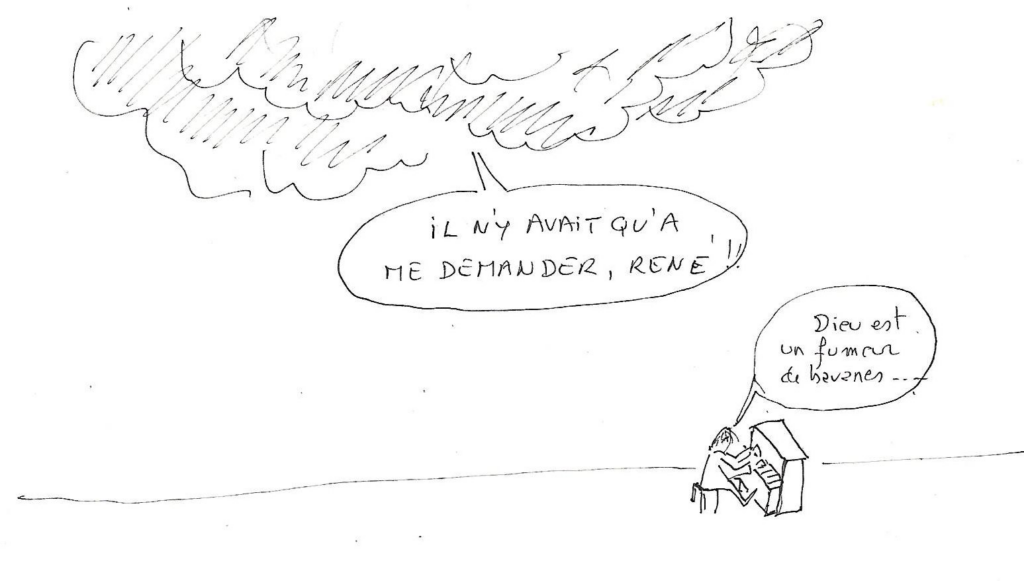 Imaginez : à l’heure de la résurrection, dans le délicieux cimetière d’Assas, village où j’ai vécu de nombreuses années, je serai accueilli par mes proches, Geneviève en tête, plus belle que jamais. Dans cette ambiance sereine, je peux sortir bouffarde et blague à tabac et retrouver avec délices l’avant-goût d’éternité que donnent les grosses volutes de fumée se dissipant dans l’azur.