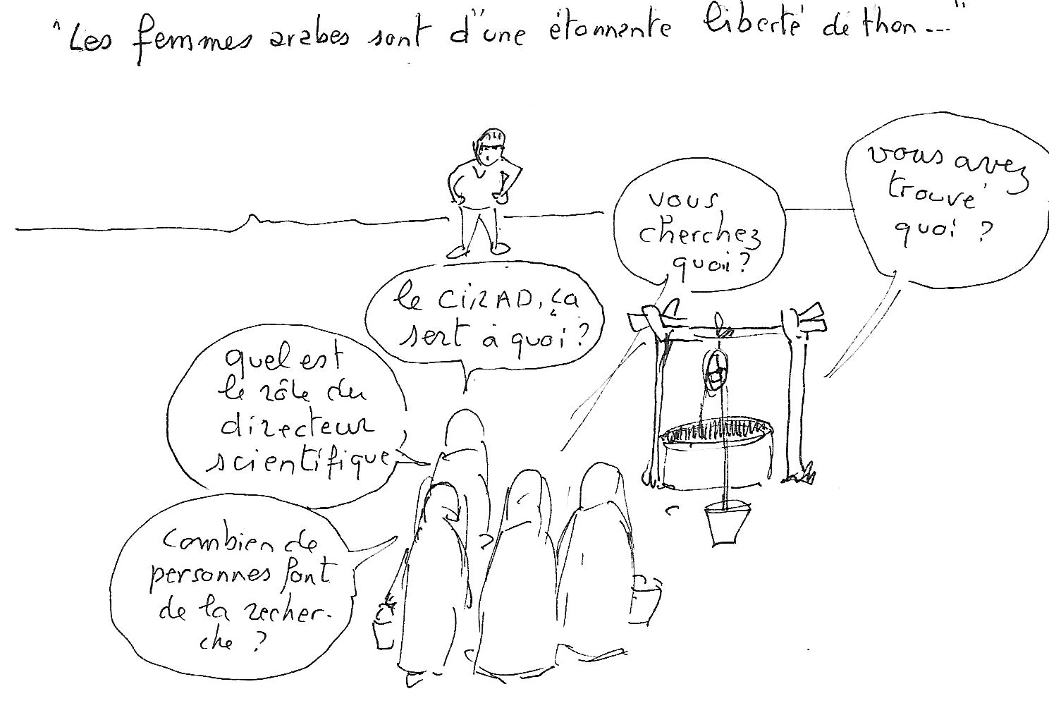 Sur le chemin du retour, nous avons croisé, au bord d’un puits, un groupe de femmes arabes chaoua : Vêtues et ornées comme à la noce, gaies, bavardes et affables, elles ont entamé avec Jean Charles un palabre : qui étions nous ? que faisions nous ? où allions nous ? Il faut dire que les femmes arabes chaoua, bien que musulmanes, sont d’une étonnante liberté de ton et de comportement. Foin bien entendu du tchador, vive les boubous bariolés, les bijoux étincelants que l’on porte en toute circonstance. Foin du mâle dominant : en ont-elles assez de leurs maris qu’elles s’en retournent le plus sereinement chez leurs parents, et c’est sur leurs époux que tombe l’opprobre publique, qui ne sera levée que lorsqu’ils auront convaincu leurs belles de bien vouloir rejoindre le foyer conjugal. Mesdames les féministes, il y a là de beaux reportages pour édifier vos militantes. Au cours de ce dialogue animé, Geneviève, avait remarqué au poignet d’une de ces dames un beau bracelet d’argent, élégamment orné, et poli au fil de nombreuses générations. Galant, notre guide lui proposa qu’elle l’achète. Gênée, elle s’en est d’abord défendue, jusqu’à ce que, très tentée, elle finisse par céder. La transaction fut bien entendu un peu longuette, la « bijoutière » imaginant derrière Geneviève un coffre fort bourré de beaux billets. L’habileté de notre guide aidant, le bracelet changea de main, ou plus précisément de poignet, dans des conditions raisonnables. Et il passera de poignet en poignet au fil des générations de la famille...