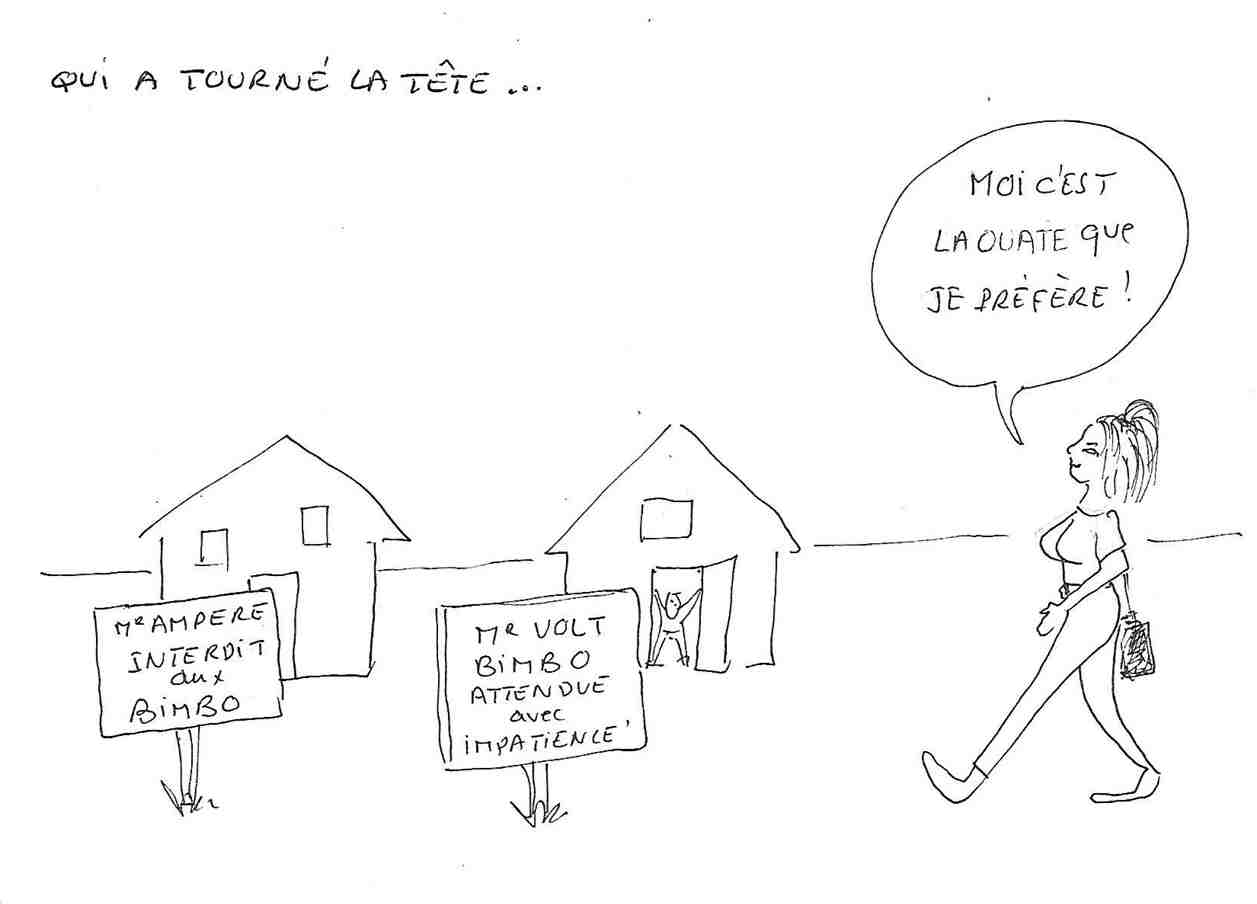Eviter à tout prix que personne ne tourne la tête du bonhomme d’Ampère : un impératif de sécurité mondiale. Qui donnera l’alerte ? Et pourtant, imaginez qu’une créature de rêve, à ses dimensions bien sûr (quelques cm, qui sait en fait ?), bénéficiant de tous les attributs nécessaires, s’approche de lui discrètement : un soupir, une musique, un parfum, il tourne la tête, et: les pôles s’inversent, les rotors tournent à l’envers : notre monde s’écroule ….